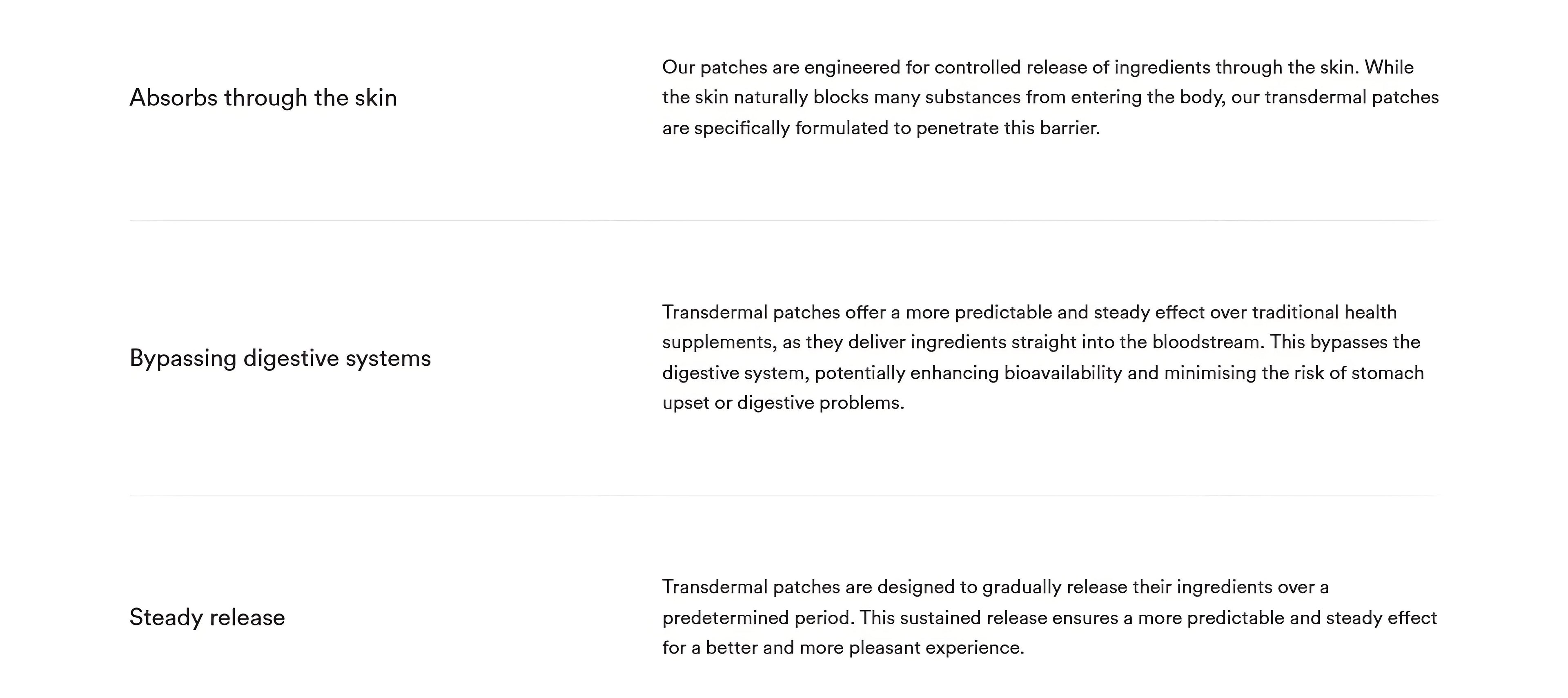 Our Mood+ Patches gradually release key ingredients throughout the day to support overall mental well-being and promote a balanced mood. By delivering ingredients like Mucuna Pruriens Extract, 5-HTP, and Rhodiola Extract, they help maintain mental clarity and emotional balance without the sudden fluctuations that can come from other sources of stimulation.