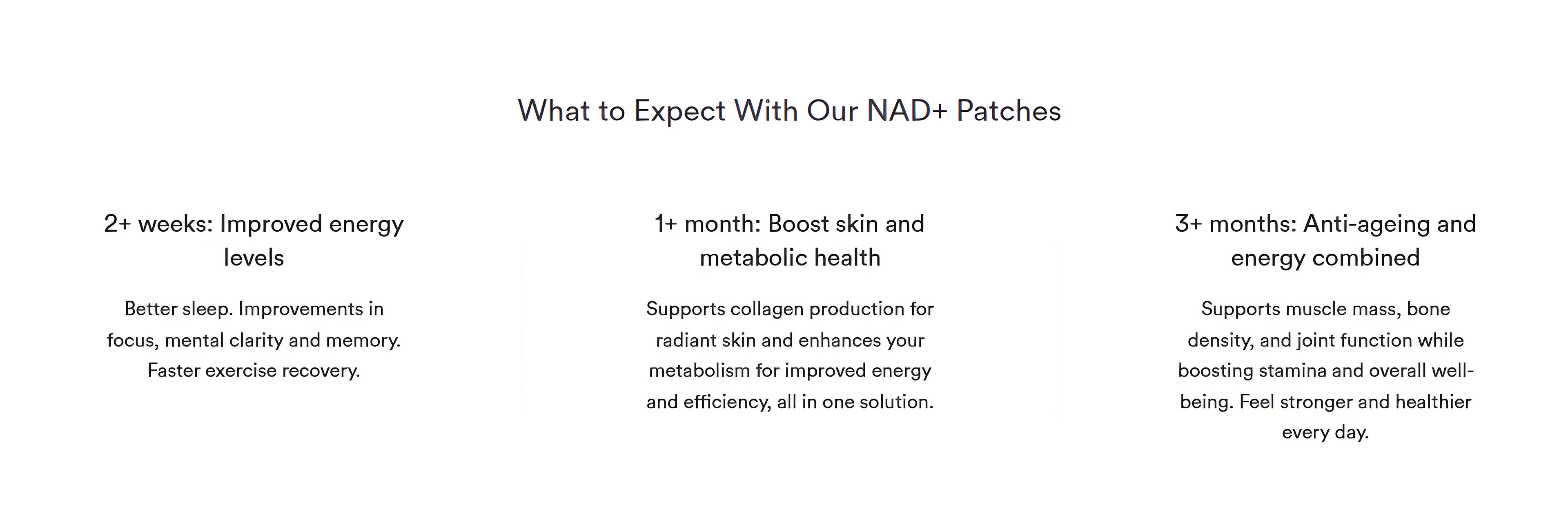 The NAD+ patch supports collagen production and protects against cellular damage.